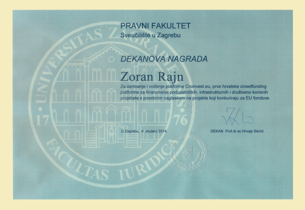 Zoran received an award from the Faculty of Law in Zagreb for creating the first legal interpretations of crowdfunding.