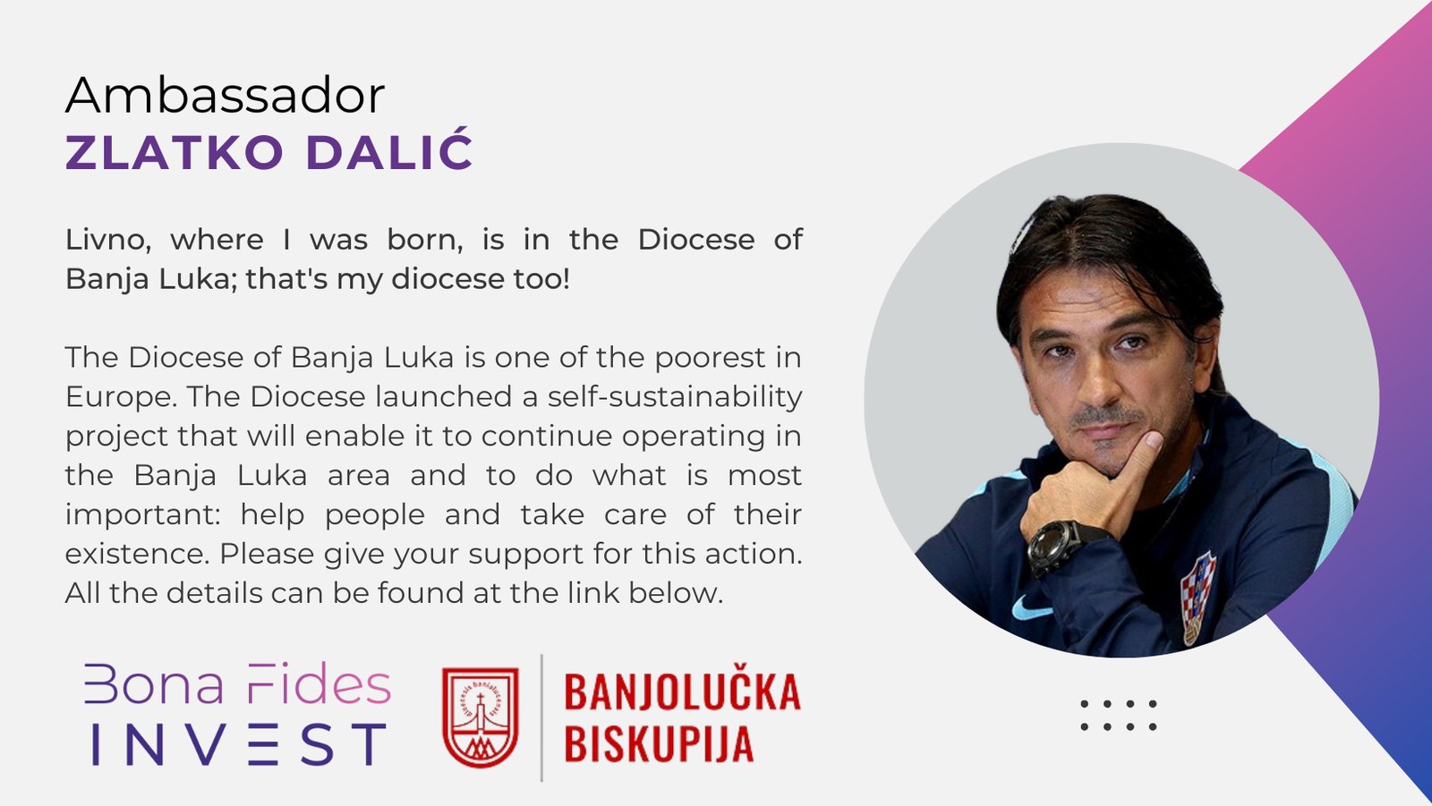 The Diocese of Banja Luka is one of the poorest in Europe. The Diocese launched a self-sustainability project that will enable it to continue operating in the Banja Luka area and to do what is most important: help people and take care of their existence. Please give your support for this action. All the details can be found at the link below. – Zlatko Dalić, coach of the Croatian national football team